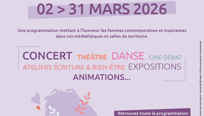 Du 2 au 31 mars 2026, spectacles, rencontres, ateliers, expositions et projections mettant à l’honneur les femmes, investiront les médiathèques et salles du territoire.